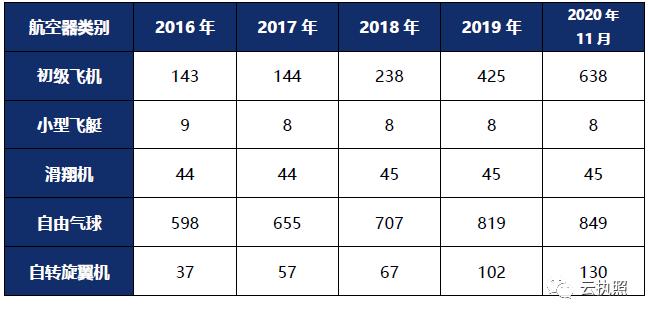 截至2020年11月23日 我国私照4561本 商照38283本 运动执照1387本 飞行执照总数为72520本