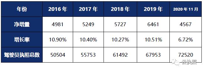 表1 驾驶员执照总数及递增统计表